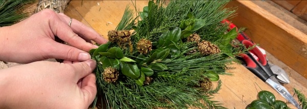 Die Basis des Kranzes bilden immergrüne Materialien wie Koniferen. Diese werden mit Deko-Objekten aus der Natur kombiniert, zum Beispiel mit Beeren, Äpfeln, Fruchtständen, getrockneten Blüten, Zapfen, Rinden und Moos. Sie haben übers Jahr selber Schätze gesammelt, die Sie für Ihren Kranz verwenden möchten? Diese dürfen Sie gerne in den Workshop mitbringen. Kerzen können bei Bedarf direkt im Kurs erworben oder selbst beigesteuert werden.