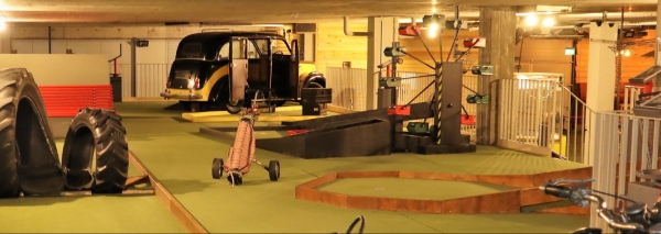 Die verschiedenen Themenwelten in der Indoor-Golfanlage sind einzigartig. Sie beginnen die Reise im Wilden Westen. Hier geht es mit dem Golfschläger vorbei an Cowboys und Goldgräbern. Danach tauchen Sie ein in die Welt der 1950er Jahre. Unterwegs begegnen Sie einem Londoner Taxi und einem Riesenrad. Später steigen Sie und Ihr Team auf ein altes Motorrad. Geniessen Sie die unterschiedlichen Themenwelten, während Sie den nächsten Abschlag vorbereiten.